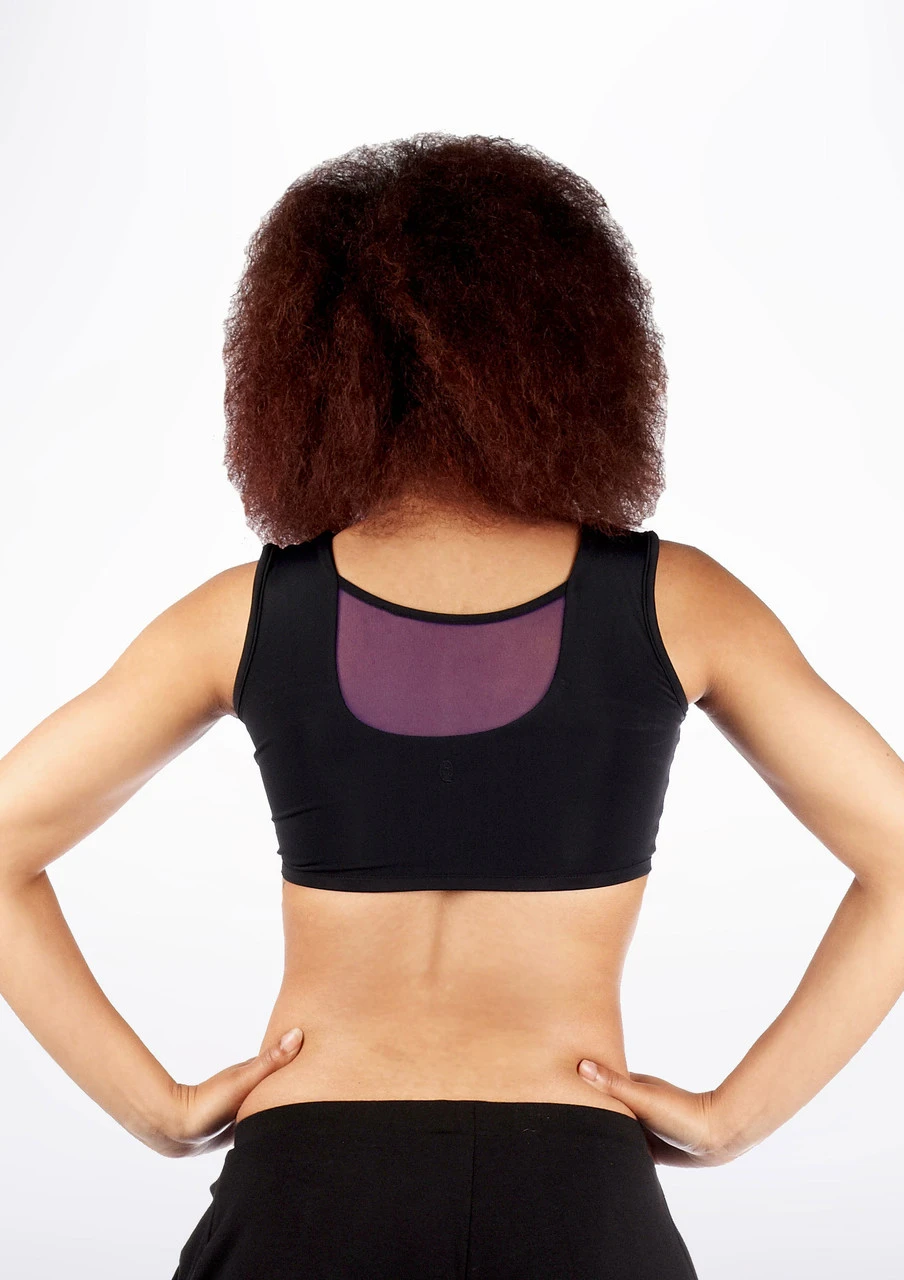 A gorgeous fitted black crop top with mesh panel details on the front and back. This crop top is completely waterproof and is ideal for various styles of dance.