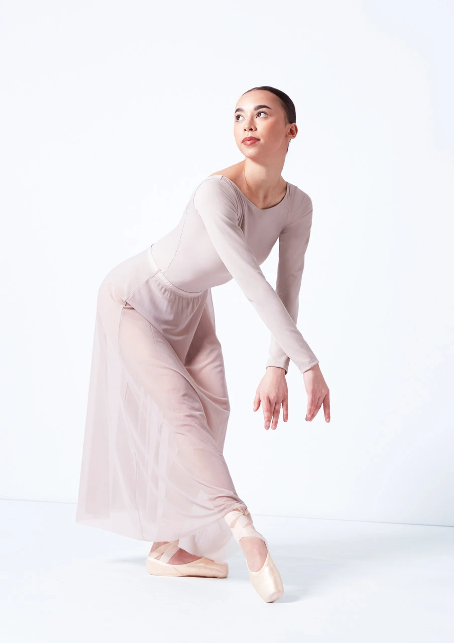 Get ready to shine in this beautiful long-line ballet skirt. It’s cut in a full circle hem and falls to a full length, perfect to add drama to your performance. The sheer mesh adds to the elegance of the skirt, flowing with your movements. The Elise is a pull-on style so easy to change backstage. Wear with the Move Dance Callie Long Sleeve Leotard for a sophisticated ballet look.