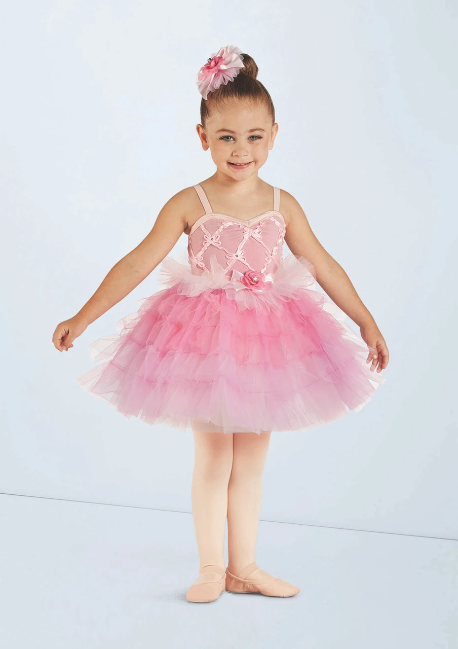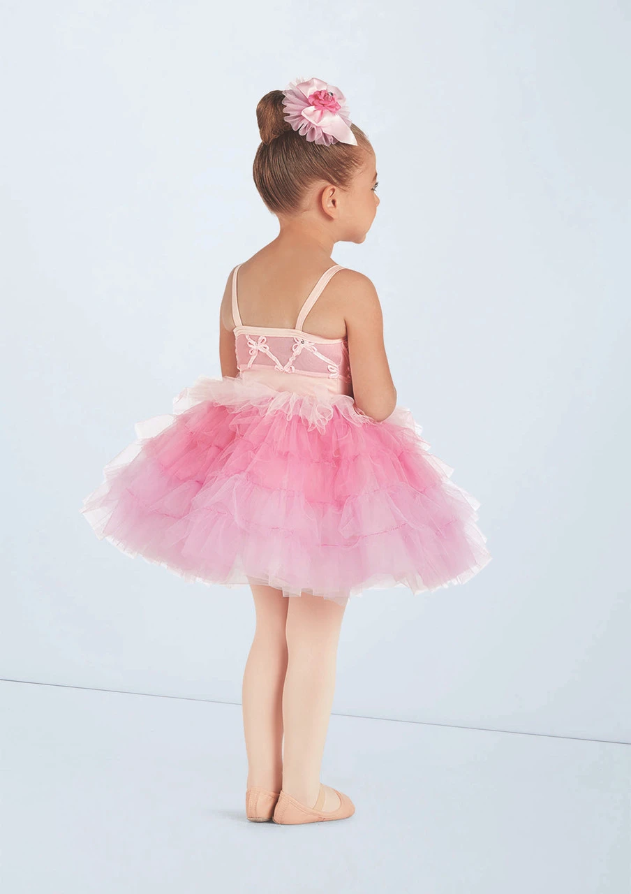 Ombré tulle ruffles comprise the top skirt