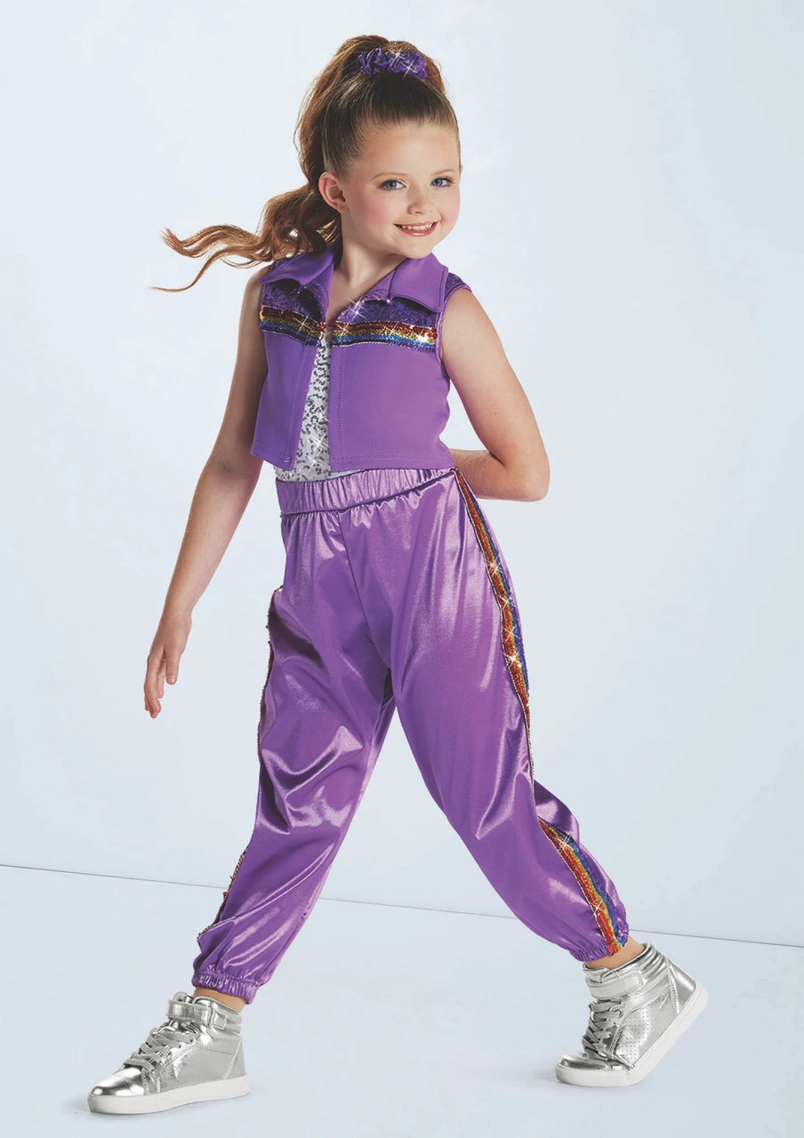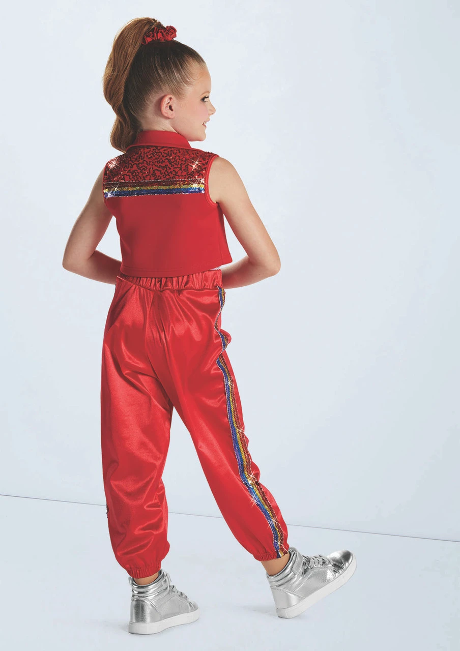 Stretch satin bottoms feature rainbow striped sequin sides