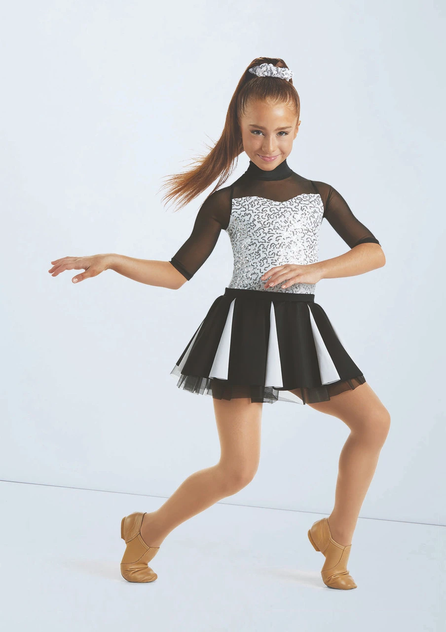 Neoprene skirt features shiny spandex godets