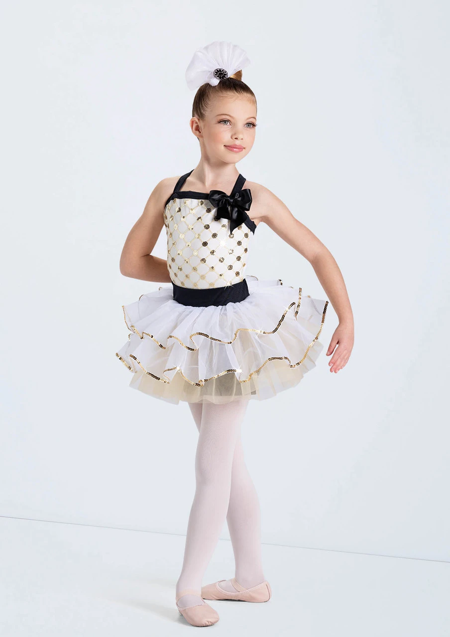 -Pull-on tutu is tricot with sequin trim on the first two tiers
