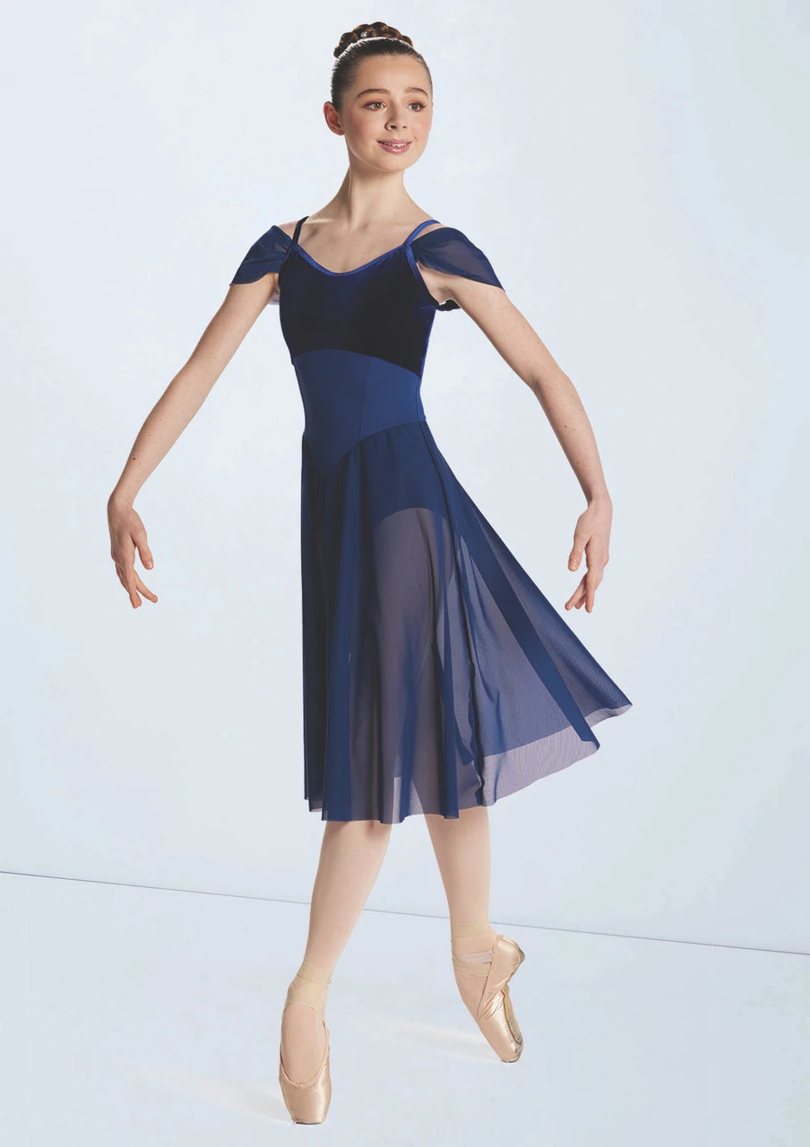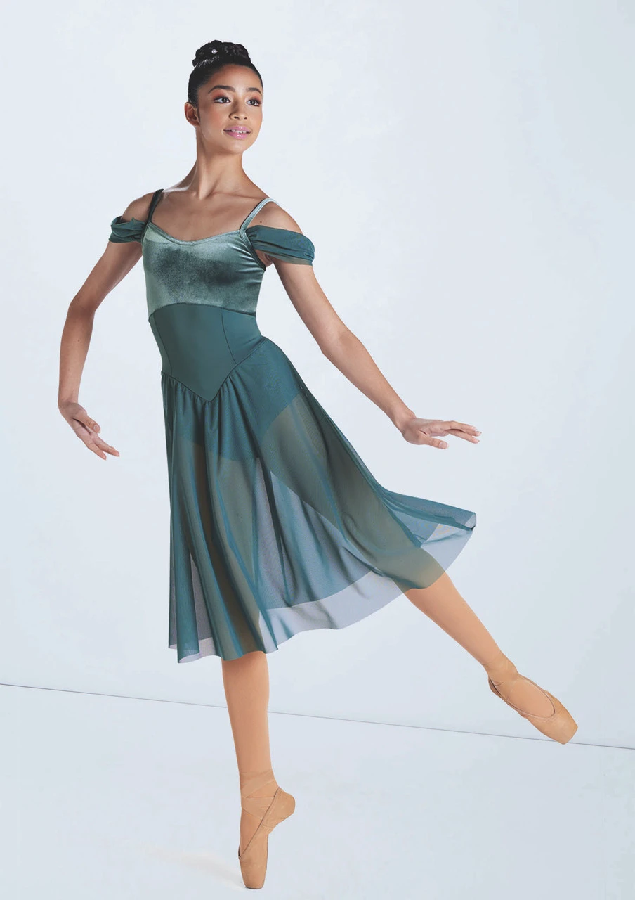 Dress features a velvet empire waist bodice
