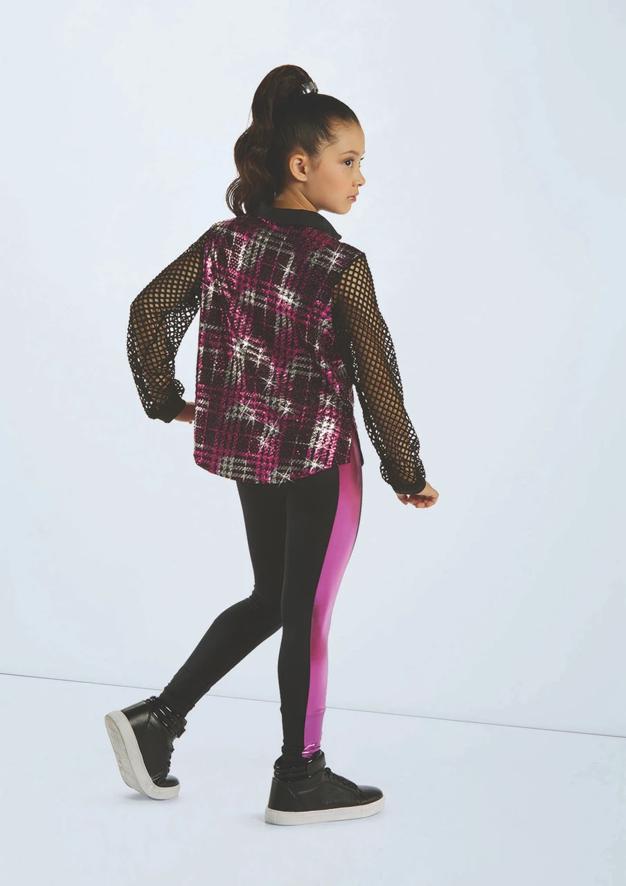 Foil dot plaid shirt has snap placket and fishnet sleeves